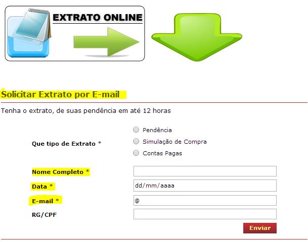 Selecione, uma das 3 opções . Pendência , Simulação de Compra , Contas Pagas. Preencha seu Nome Completo, para que o sistema possa, reconhecer, o seu cadastro. Coloque a DATA. E digite, seu E-mail para que, o sistema envie seu Extrato. (Atenção): Não erre, o seu E-mail, pois, após você preencher, será enviado para o mesmo.